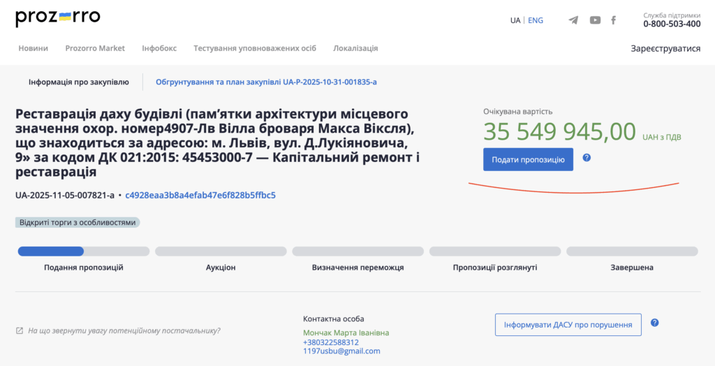 Коротко про закупівлю: завищена вартість у 3–5 разів, не доведена аварійність, звужена конкуренція, нелогічні техвимоги. 35,5 млн грн за ремонт лише даху — не реставрація, а роздута схема.