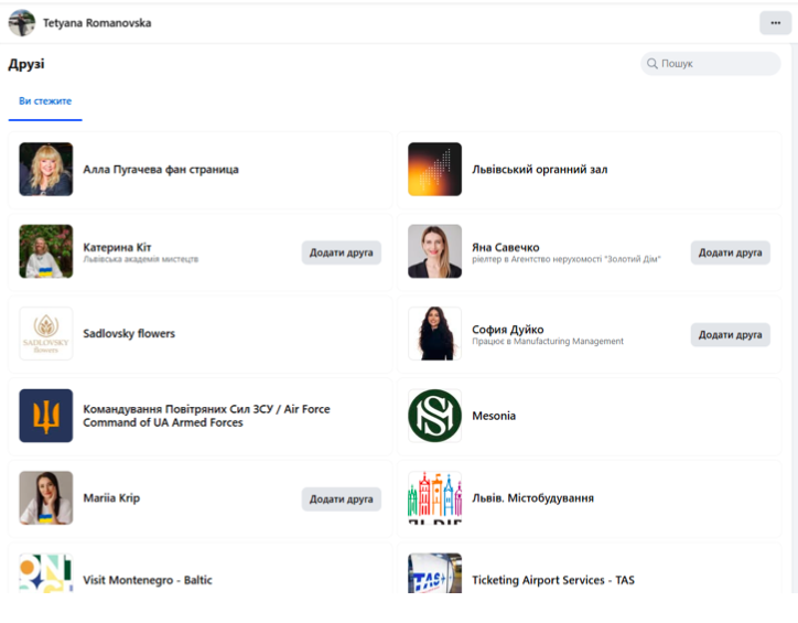 При поверхневому аналізі акаунтів Романовської в Facebook можна запросто знайти десятки контактів із громадянами рф. Більшість із друзів Романовської це особи, пов’язані з держструктурами та великими державними компаніями росіями.